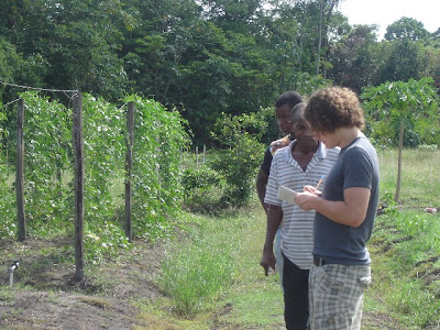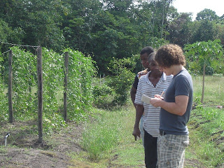 Daarna zijn we met meneer Pinas naar het landbouwbedrijf van Gavin LePita, die op een zelfde wijze van toepassen van irrigatie en opzet kool, kouseband, watermeloen, papaya en antroewa verbouwde. We spraken met beide boeren over gewassen en hun kwetsbaarheden, insecticiden, bemesting en irrigatie.