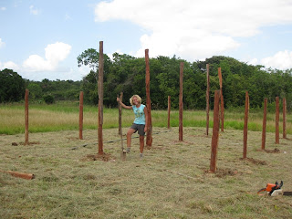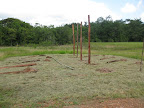 Het plaatsen van de overige kleinere wallaba palen (2,5 meter) ging voorspoedig en rond 3 uur stonden alle palen in de grond in de juiste positie.