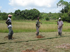 Daarna zijn we met z´n drieen, meneer Dijkman, Meinou en Rick, gaan graven op de plekken waar de wallaba palen zouden komen staan, zodat ze stevig in de grond zullen staan. Dit kostte echter meer werk dan gedacht omdat de grond erg taai en zwaar is, waardoor het scheppen een zware taak maakte, vooral op het onbeschutte terrein in de brandende zon. Niet veel later kwamen broeder August en broeder Hari ons team versterken.